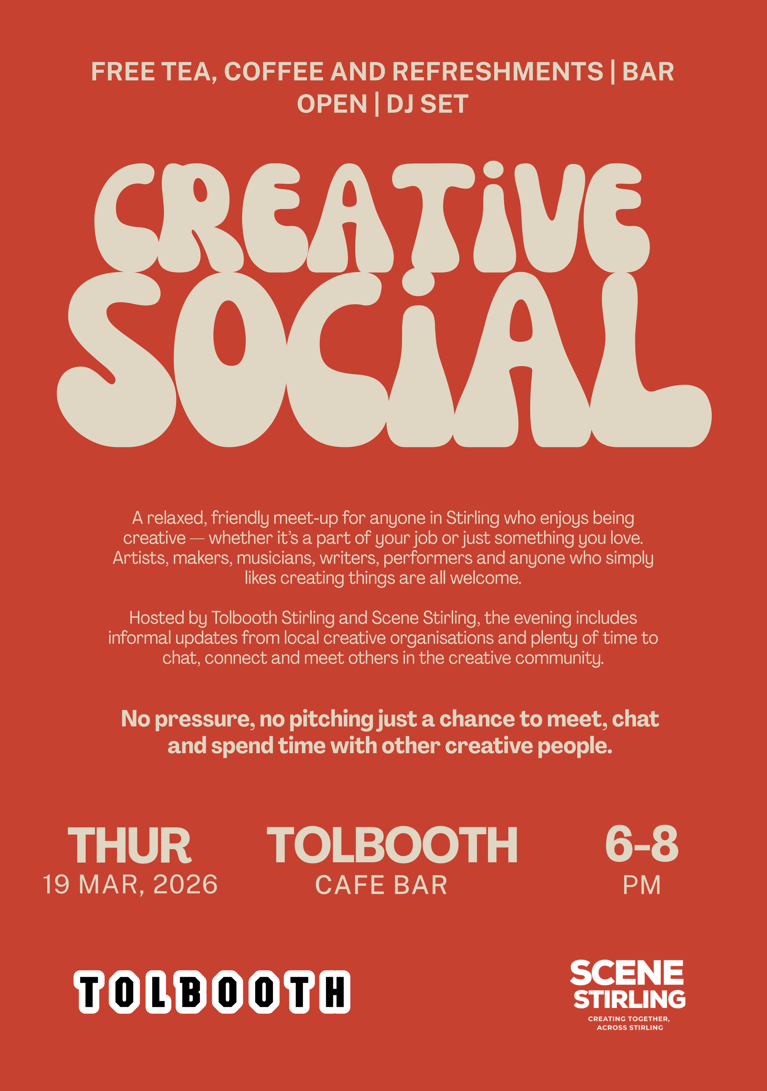 Hosted by Tolbooth Stirling in partnership with Scene Stirling, the evening will include informal updates from local creative organisations and the opportunity to talk directly to them plus plenty of time to talk and connect with each other.